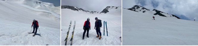標高2550m付近から再び傾斜が急になり、しかもクラストしており、スキーアイゼンを有効に使い登ったのだが、スキーアイゼンを装着しない者は苦労して登り2650m付近の平坦な所で、その先に行くのを諦めてシールを剥がし滑走準備に入る。