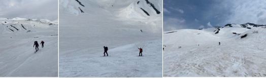 標高2440m付近まで1時間ほどハイクアップする。その後、雷鳥沢へ滑り込むが上部はガリガリで少し標高を落とすと滑りやすい雪となった。2330m付近まで滑り、再びシールを付けハイクアップして2440m付近でシールを取り滑る。9時45分に雷鳥平に戻りテントを撤収して、室堂に11時15分に着くと雪が降り始めた。荷物を整理して12時のバスに乗り、ロープウエイ、ケーブル、バスを乗り継ぎ順調に15時に扇沢に着いた。車に乗り込むと雨が降り始めた。