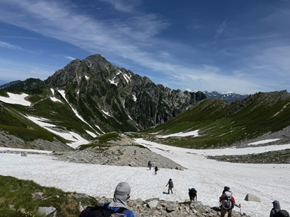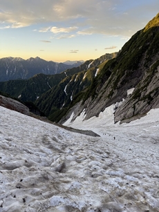 早めに起きて準備を済ませ、事前に予約した6時半始発の電気バスで出発し、8時頃に室堂に着き、水を補充してから出発した。11時19分に剱沢キャンプ場に着き、富山県警山岳警備隊剱沢派出所にて登山届を提出し、雪渓の状況を確認した。