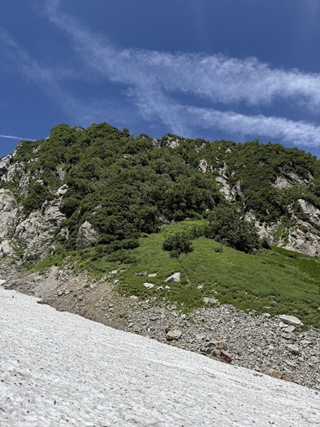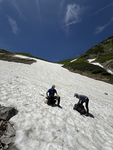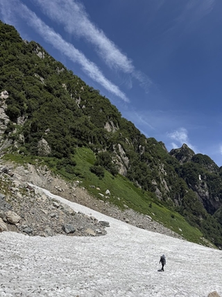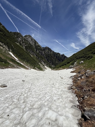 クロユリの滝のあたりは雪渓が脆くなっていたが、武蔵谷のかなり前から雪渓が安定した為、10本爪アイゼンを装着して快適に剱沢雪渓を下った。長次郎谷出合から下部のナムの滝は露出している事を事前に聞いていた為、右岸の夏道を歩き、13時01分に真砂沢ロッジに到着した。