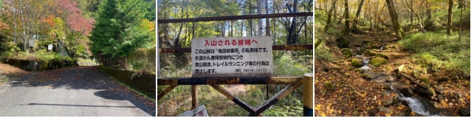 当初は26日に出発予定であったが、天気が悪いので1日ずらして27日に出発とした。八王子駅8時03分発の特急あずさ3号で山梨市駅に4分遅れの9時02分に着いた。山梨市駅発9時12分発のバスで新地平に10時00分に着いて、林道を歩き「亀田林業所林道」を行く。このルートが笠取小屋への最短ルートである。最初の1時間は展望も無く面白味に欠ける林道であったが、紅葉が見られ沢筋を歩くようになると雰囲気が良くなった。